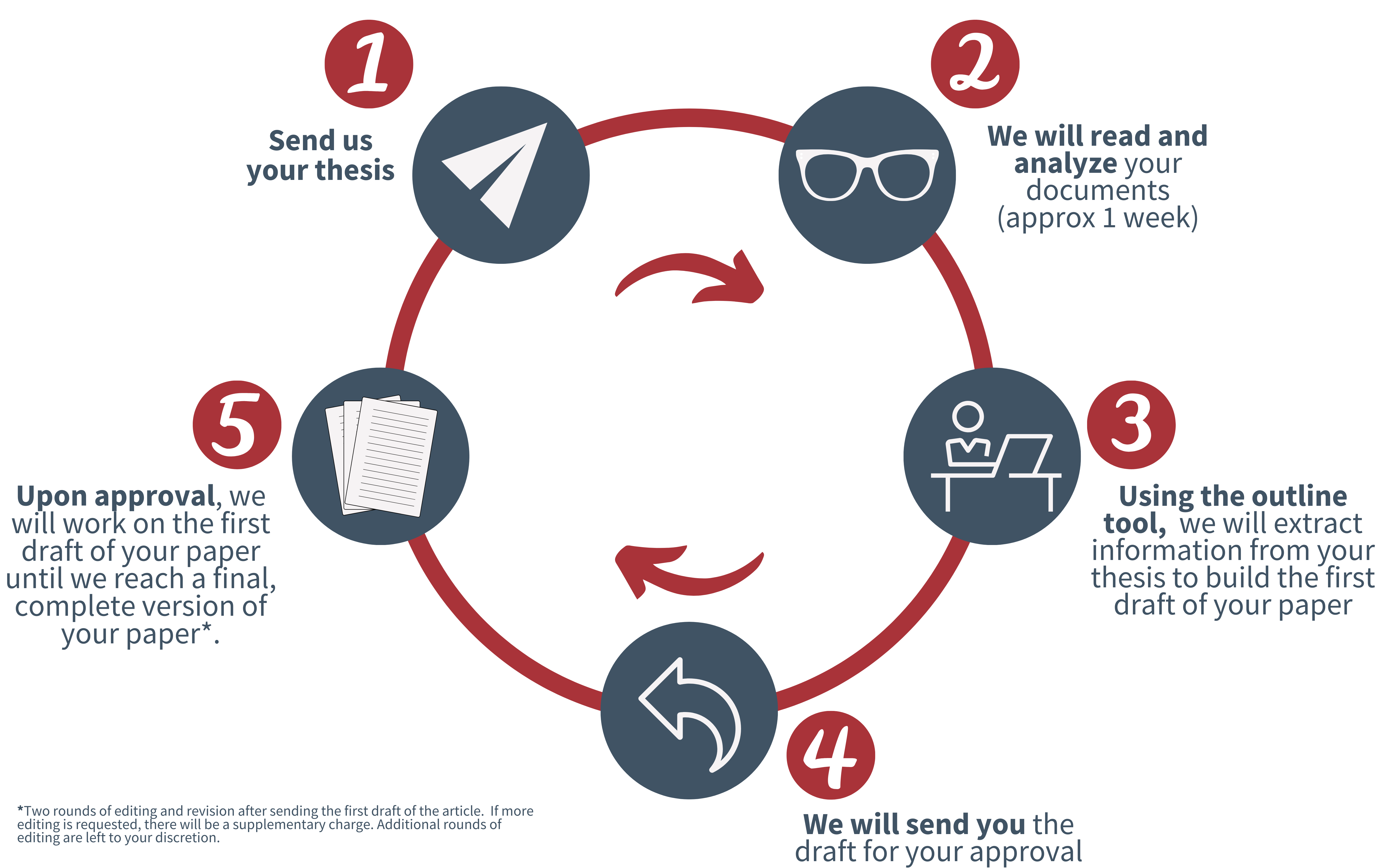 If you need to extract parts of your thesis to produce a scientific paper, we can help. We will read your thesis and extract all the necessary information to build a scientific paper with a coherent narrative. See below how it works.